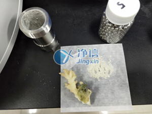 将海底珊瑚剪成小块放入50毫升钢罐中,加入专用研磨珠拧紧钢罐后放入研磨机里,调整好参数待结束后即可得到实验结果。