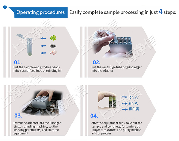 Shanghai Jingxin® Tissuelyser® tissue grinder (patented product, counterfeiting must be punished! 201620363493X) is a special, fast, efficient, multi-tube consistent system. It can extract and purify the original DNA, RNA and protein from any source (including soil, plant and animal tissues/organs, bacteria, yeast, fungi, spores, paleontological specimens, etc.).