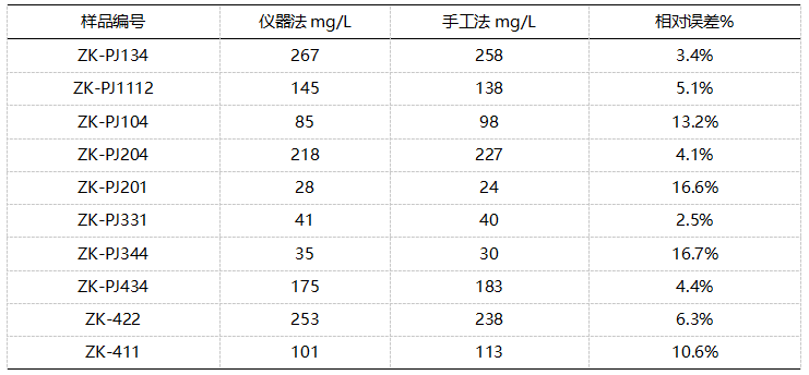 根据实验数据结果显示:仪器法测试结果和手工法测试结果均小于20%,JX-C7048满足实际工作的需要。