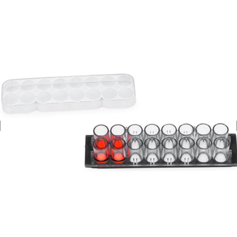 盖玻片上的腔室共16个,分2排,各8孔(如图示),每孔的内直径6mm。设计的每孔体积和孔距与标准96孔板的相同,无细胞毒性的硅胶孔垫片(silicone well gasket)与上层聚苯乙烯材料的腔室(the upper structure,厚0.5mm)和基层的硼硅酸盐盖玻片(the substructure,厚0.16-.19mm)形成滴水不漏的密封。有上层腔室时每孔体积250µl,去掉上层腔室后每孔体积9µl。