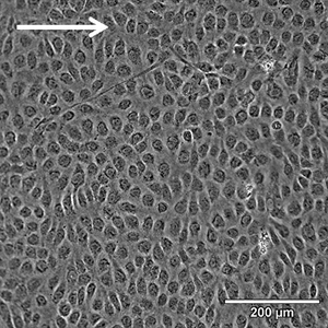 注意流动下培养5天后的鹅卵石样细胞形态。20倍物镜。