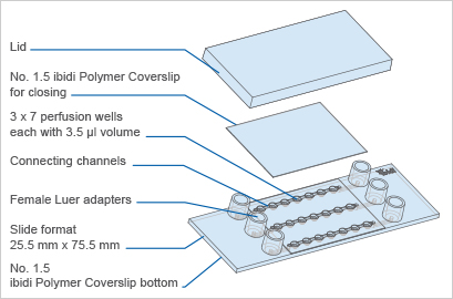 µ-Slide球体灌注是用于培养自由漂浮的3D聚集体的专用流动室。它由3 x 7平底孔组成,这些孔通过上方的通道连接。每个孔形成自己的壁,在此培养标本。